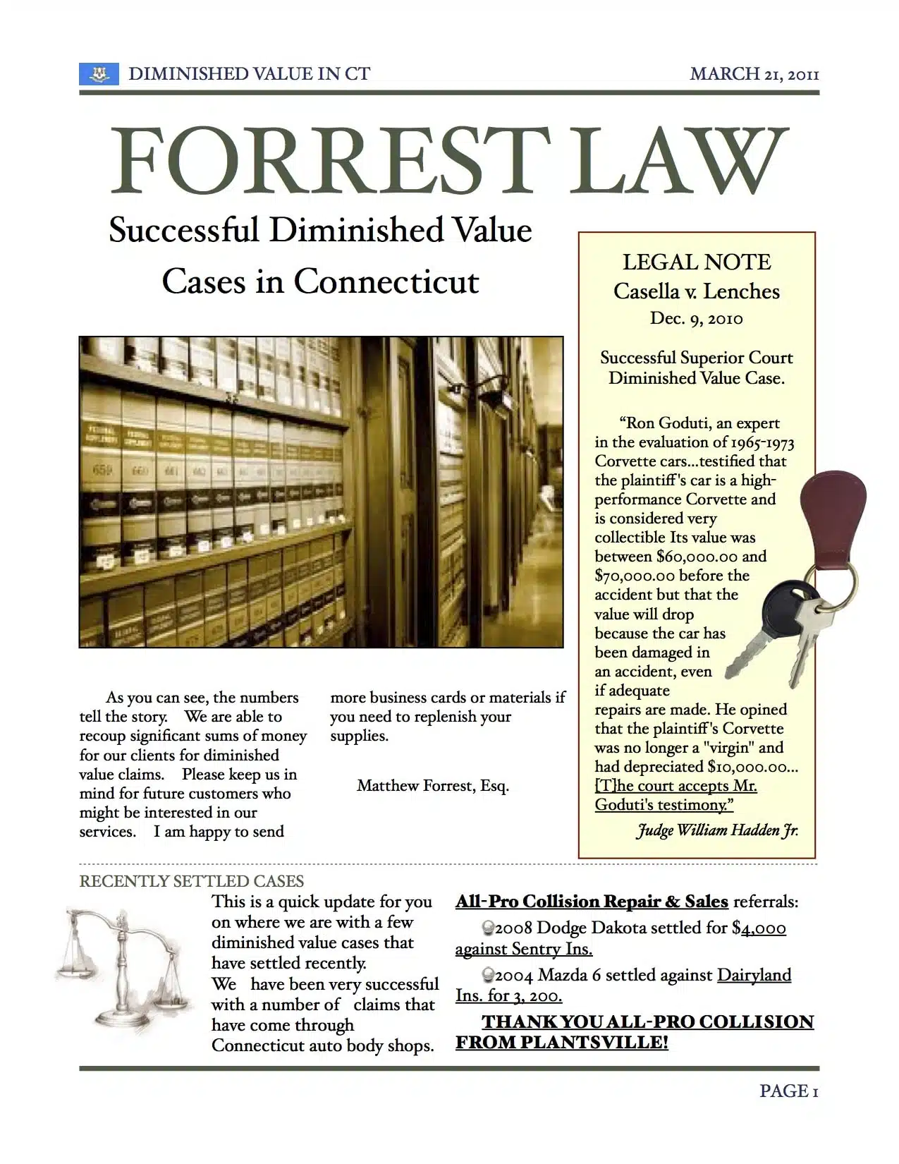 Successful Diminished Value Cases in Connecticut As you can see, the numbers tell the story. We are able to recoup significant sums of money for our clients for diminished value claims. Please keep us in mind for future customers who might be...